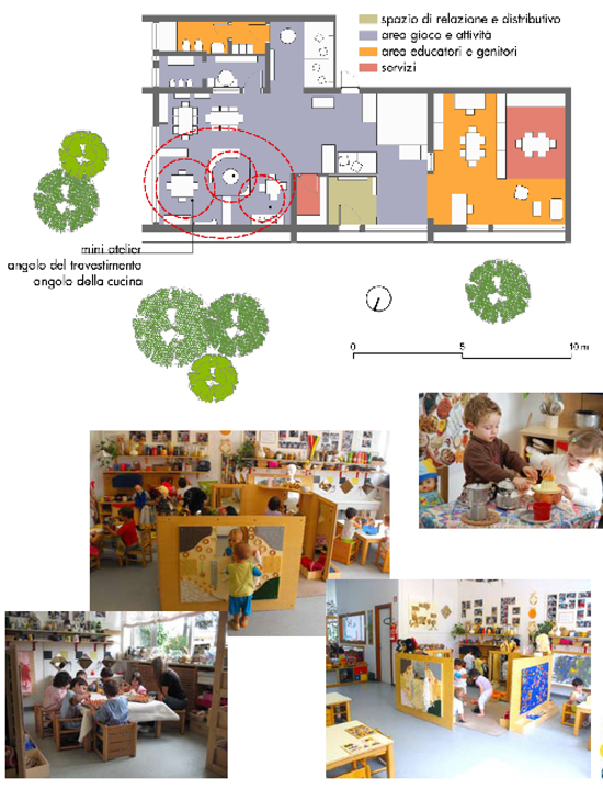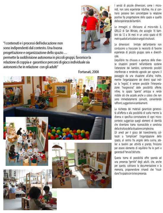 Le Buone Pratiche Progettare lo spazio per il protagonismo dei bambini di Aldo Fortunati, Gloria Tognetti e Sara Zingoni servizi di piccole dimensioni, come i micronidi, non sono esperienze riduttive, ma al contrario possono ben concretizzare la relazione positiva fra progettazione dello spazio e qualità delle esperienze dei bambini. Le immagini si riferiscono al micro-nido IL GRILLO di San Miniato, che accoglie 16 bambini da 12 a 36 mesi in un unico spazio di 95 metri quadrati articolato in angoli strutturati. Le dimensioni limitate dell'ambiente non conducono a trascurare la necessità di favorire esperienze di piccolo gruppo varie e diversificate. L'equilibrio tra chiusura e apertura delle diverse situazioni presenti nell'ambiente sostiene l'attenzione dei bambini, contenendo possibili interferenze e rendendo agevole per ognuno il passaggio da una situazione all'altra; inoltre, mentre l'organizzazione dei diversi spazi indica la "regola", è sempre possibile l'interpretazione "trasgressiva" delle possibilità offerte; infine, lo spazio "aperto" anticipa e rende visibile ciò che accade anche a coloro che non sono immediatamente coinvolti, consentendo raffronti, suggestioni e cambiamenti. ![]() ![]() Le Buone Pratiche |