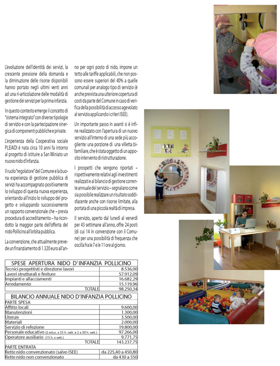 Le Buone Pratiche Anche il privato concorre al sistema integrato dei servizi educativi per l'infanzia L'esperienza della Cooperativa sociale Le Pleiadi a San Miniato (PI) di Aldo Fortunati, Monica Buoncristiani e Giovanna Duranti L'evoluzione dell'identità dei servizi, la crescente pressione della domanda e la diminuzione delle risorse disponibili hanno portato negli ultimi venti anni ad una ri-articolazione delle modalità di gestione dei servizi per la prima infanzia. In questo contesto emerge il concetto di "sistema integrato" con diverse tipologie di servizio e con la partecipazione sinergica di componenti pubbliche e private. L'esperienza della Cooperativa sociale Pleiadi è nata circa 10 anni fa intorno al progetto di istituire a San Miniato un nuovo nido d'infanzia ![]() ![]() Le Buone Pratiche |