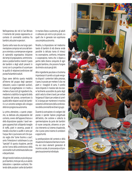 Le Buone Pratiche Mangiare insieme Il pranzo come contesto di relazione, conoscenza, autonomia di Aldo Fortunati e Erica Bagni Nell'esperienza dei nidi di San Miniato il momento del pranzo rappresenta un contesto di convivialità condivisa fra bambini, educatori e operatori. Questa scelta nasce da una lunga sperimentazione compiuta nel corso del tempo e orientata a contemperare esigenze di razionalità organizzativa (riduzione dei tempi di preparazione, somministrazione e pulizia/riordino inerenti il pasto dei bambini e degli adulti presenti in turno) con la prospettiva di accentuare le qualità di relazione/condivisione del pranzo fra bambini e adulti. ![]() ![]() Le Buone Pratiche |