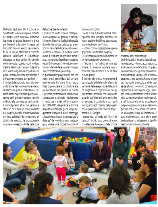 Le Buone Pratiche Gruppi di genitori in auto-gestione Una nuova opzione dell'area incontro e gioco Il Paese dei Balocchi di San Miniato di Aldo Fortunati e Jessica Magrini Dall'inizio degli anni '90, il Comune di San Miniato iniziò ad ampliare l'offerta dei propri servizi educativi, attraverso l'apertura di un'area incontro e gioco per bambini e famiglie "Il paese dei balocchi"; il nuovo servizio ha consentito, da un lato, di diffondere la proposta culturale sull'infanzia e l'educazione elaborata nel nido anche alle famiglie non interessate a questo tipo di servizio, mentre, dall'altro, ha reso possibile offrire in forma congiunta un'opportunità di gioco e di socializzazione per i bambini e di incontro e confronto per i genitori. Il servizio è stato attivato in un micro-nido funzionante in orario anti-meridiano, all'interno del quale si è definita una relazione diretta e aperta fra lo spazio predisposto per il gioco dei bambini e quello dedicato alla permanenza degli adulti. Il coinvolgimento attivo dei genitori è stato fin da subito un nodo fondante del progetto, sia nella prospettiva di una gestione collegiale del programma di attività del servizio, sia promuovendo una piena corresponsabilità nella cura buone ide dell'ambiente e dei materiali. ![]() ![]() Le Buone Pratiche |