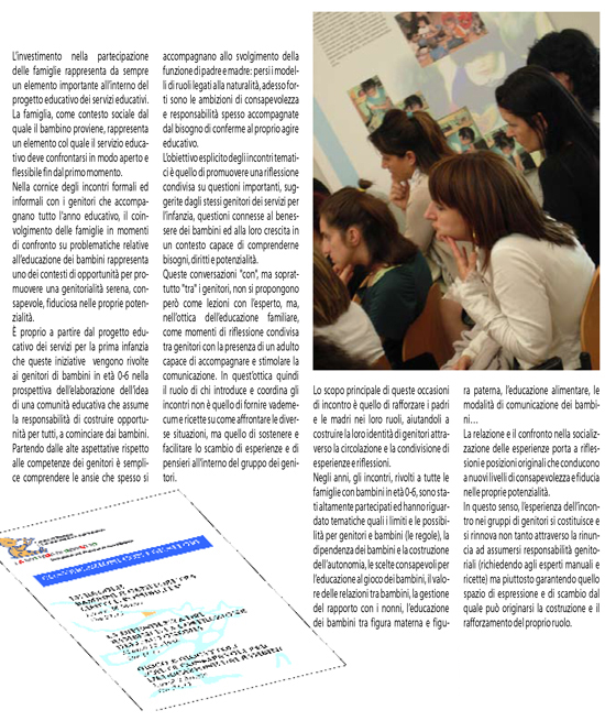 Le Buone Pratiche Conversando di problemi educativi Scambiare e condividere riflessioni per costruire ed evolvere il ruolo di genitori di Aldo Fortunati, Barbara Pagni, Jessica Magrini L'investimento nella partecipazione delle famiglie rappresenta da sempre un elemento importante all'interno del progetto educativo dei servizi educativi. La famiglia, come contesto sociale dal quale il bambino proviene, rappresenta un elemento col quale il servizio educativo deve confrontarsi in modo aperto e flessibile fin dal primo momento. Nella cornice degli incontri formali ed informali con i genitori che accompagnano tutto l'anno educativo, il coinvolgimento delle famiglie in momenti di confronto su problematiche relative all'educazione dei bambini rappresenta uno dei contesti di opportunità per promuovere una genitorialità serena, consapevole, fiduciosa nelle proprie potenzialità. ![]() ![]() Le Buone Pratiche |