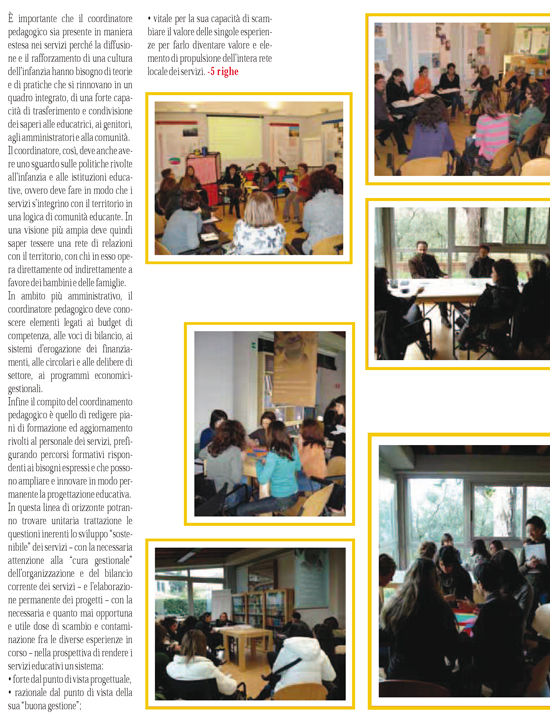 Le Buone Pratiche Una risorsa di sistema Le funzioni di direzione e coordinamento pedagogico per lo sviluppo e la qualificazione del sistema integrato dei servizi educativi di Aldo Fortunati, Jessica Magrini e Barbara Pagni Nel corso degli anni l'identità, la funzione e la qualificazione dei servizi educativi per la prima infanzia si sono evoluti e questo percorso ha coinvolto protagonisti diversi – educatori, responsabili amministrativi e pedagogisti – che, lavorando in maniera congiunta, hanno potuto contribuire al complessivo sviluppo e definizione dei servizi. Questa evoluzione è stata caratterizzata non solo da una rinnovata identità dei servizi, ma anche da una diversificazione dell'offerta, attraverso l'apertura di tipologie di servizi diverse da quelle tradizionali con l'aggiunta dei servizi integrativi, e ![]() ![]() Le Buone Pratiche |