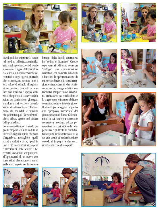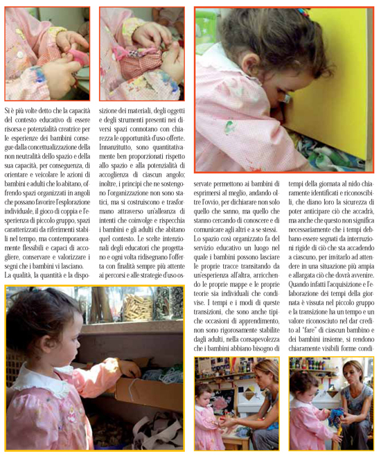 Le Buone Pratiche Ordine, disordine, organizzazione Appropriarsi dell'esperienza utilizzando e riorganizzando le opportunità di Aldo Fortunati, Gloria Tognetti e Sara Zingoni Si è più volte detto che la capacità del contesto educativo di essere risorsa e potenzialità creatrice per le esperienze dei bambini consegue dalla concettualizzazione della non neutralità dello spazio e della sua capacità, per conseguenza, di orientare e veicolare le azioni di bambini e adulti che lo abitano, offrendo spazi organizzati in angoli che possano favorire l'esplorazione individuale, il gioco di coppia e l'esperienza di piccolo gruppo, spazi caratterizzati da riferimenti stabili nel tempo, ma contemporaneamente fl essibili e capaci di accogliere, conservare e valorizzare i segni che i bambini vi lasciano. ![]() ![]() Le Buone Pratiche |