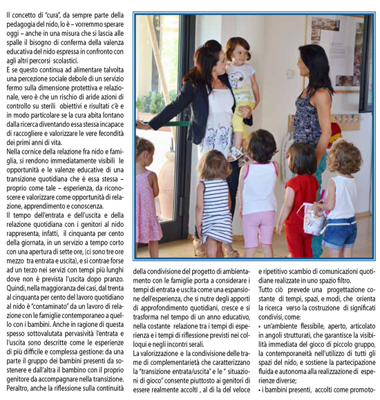 Le Buone Pratiche Quando la ricerca della cura è cura della ricerca La transizione entrata e uscita come contesti di relazione e condivisione con le famiglie di Aldo Fortunati, Sara Zingoni e Annalisa Bessi Il concetto di "cura", da sempre parte della pedagogia del nido, lo è – vorremmo sperare oggi – anche in una misura che si lascia alle spalle il bisogno di conferma della valenza educativa del nido espressa in confronto con agli altri percorsi scolastici. E se questo continua ad alimentare talvolta una percezione sociale debole di un servizio fermo sulla dimensione protettiva e relazionale, vero è che un rischio di aride azioni di controllo su sterili obiettivi e risultati c'è e in modo particolare se la cura abita lontano dalla ricerca diventando essa stessa incapace di raccogliere e valorizzare le vere fecondità dei primi anni di vita. ![]() ![]() Le Buone Pratiche |