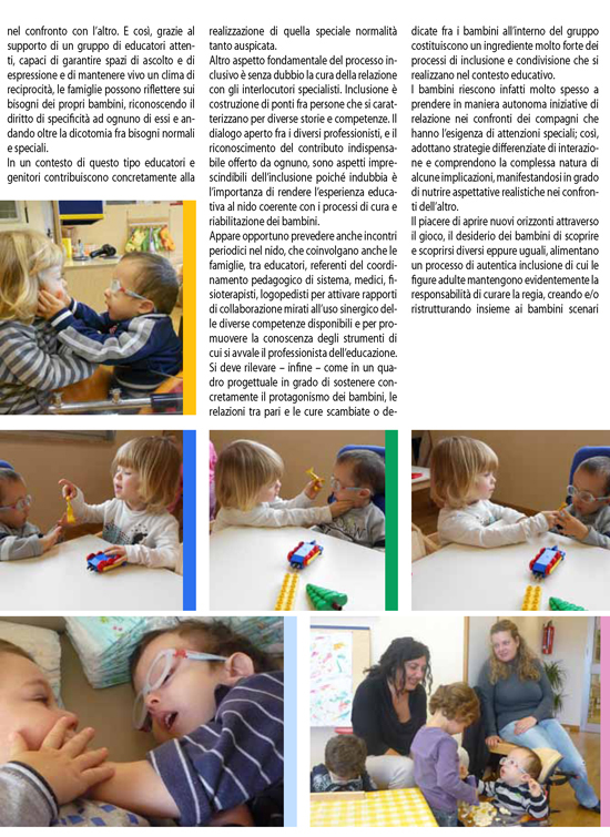 Le Buone Pratiche Quando la diversita' diventa... speciale L'inclusione come valorizzazione – e messa in relazione – delle potenzialità individuali di Aldo Fortunati e Chiara Parrini Il tema della diversità si compenetra – come si è detto più volte – con la concezione e lo svolgimento del processo educativo e si fonda sul riconoscimento dell'identità e delle potenzialità individuali come presupposto fondamentale su cui costruire e sviluppare crescita, relazioni e apprendimento. E sebbene il riferimento alla condizione di handicap – o come più modernamente e correttamente si dice di diversabilità – porti dentro di sé spesso il rigurgito di una interpretazione deficitaria piuttosto che potenziale dell'identità individuale, in realtà accogliere nel nido i bambini e le bambine con "diritti speciali" (preferendo parlare di "diritti" piuttosto che di "bisogni") può essere davvero l'occasione per ampliare la percezione della straordinaria pluralità di modi attraverso cui è realmente possibile costruire la propria esperienza del mondo. ![]() ![]() Le Buone Pratiche |