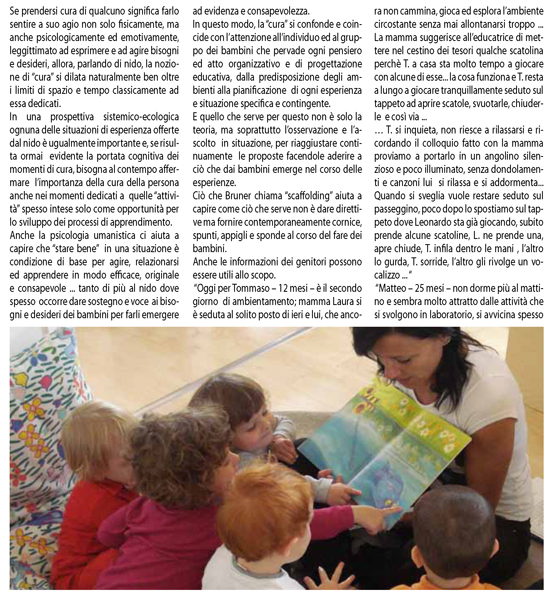 Le Buone Pratiche Non solo nelle situazioni di cura La cura dell'accoglienza delle diversità nelle situazioni di gioco strutturato di Aldo Fortunati, Angela Brogi e Annalisa Bessi Se prendersi cura di qualcuno significa farlo sentire a suo agio non solo fisicamente, ma anche psicologicamente ed emotivamente, leggittimato ad esprimere e ad agire bisogni e desideri, allora, parlando di nido, la nozione di "cura" si dilata naturalmente ben oltre i limiti di spazio e tempo classicamente ad essa dedicati. In una prospettiva sistemico-ecologica ognuna delle situazioni di esperienza offerte dal nido è ugualmente importante e, se risulta ormai evidente la portata cognitiva dei momenti di cura, bisogna al contempo affermare l'importanza della cura della persona anche nei momenti dedicati a quelle "attività" spesso intese solo come opportunità per lo sviluppo dei processi di apprendimento. ![]() ![]() Le Buone Pratiche |