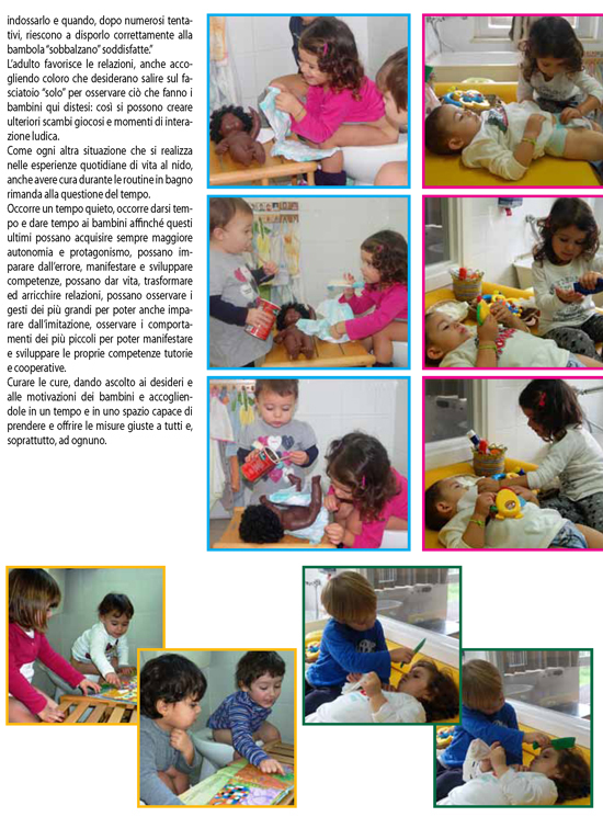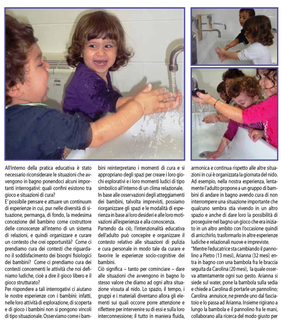 Le Buone Pratiche Cure in gioco Il bagno come contesto di espressione di protagonismi e autonomie di Aldo Fortunati, Manuela Tanzini e Nadia Testi All'interno della pratica educativa è stato necessario riconsiderare le situazioni che avvengono in bagno ponendoci alcuni importanti interrogativi: quali confini esistono tra gioco e situazioni di cura? E' possibile pensare e attuare un continuum di esperienze in cui, pur nelle diversità di situazione, permanga, di fondo, la medesima concezione del bambino come costruttore delle conoscenze all'interno di un sistema di relazioni, e quindi organizzare e curare un contesto che crei opportunità? Come ci prendiamo cura dei contesti che riguardano il soddisfacimento dei bisogni fisiologici dei bambini? Come ci prendiamo cura dei contesti concernenti le attività che noi definiamo ludiche, cioè a dire il gioco libero e il gioco strutturato? ![]() ![]() Le Buone Pratiche |