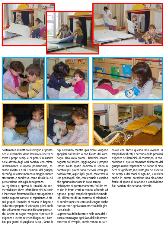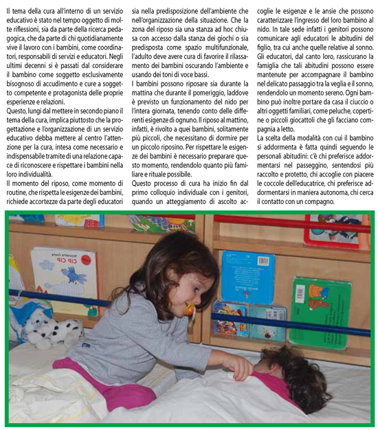 Le Buone Pratiche Dormire con cura L'attenzione a ogni bambino e al gruppo nel momento del riposo di Aldo Fortunati, Erica Bagni e Silvia Tani Il tema della cura all'interno di un servizio educativo è stato nel tempo oggetto di molte riflessioni, sia da parte della ricerca pedagogica, che da parte di chi quotidianamente vive il lavoro con i bambini, come coordinatori, responsabili di servizi e educatori. Negli ultimi decenni si è passati dal considerare il bambino come soggetto esclusivamente bisognoso di accudimento e cure a soggetto competente e protagonista delle proprie esperienze e relazioni. Questo, lungi dal mettere in secondo piano il tema della cura, implica piuttosto che la progettazione e l'organizzazione di un servizio educativo debba mettere al centro l'attenzione per la cura, intesa come necessario e indispensabile tramite di una relazione capace di riconoscere e rispettare i bambini nella loro individualità. ![]() ![]() Le Buone Pratiche |