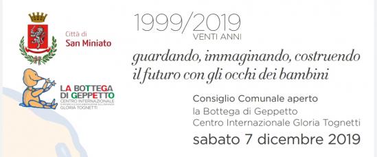 Sabato 7 dicembre Consiglio Comunale aperto per il ventennale della Bottega di Geppetto In occasione del ventennale della Bottega di Geppetto - Centro Internazionale di Ricerca e Documentazione sull’Infanzia Gloria Tognetti, l’Amministrazione Comunale apre le celebrazioni della ricorrenza con un Consiglio Comunale aperto che vuole essere occasione di incontro per condividere insieme alla comunità il valore, le potenzialità e le prospettive del consolidato impegno del Comune di San Miniato a favore dello sviluppo delle politiche educative per l’infanzia. |
